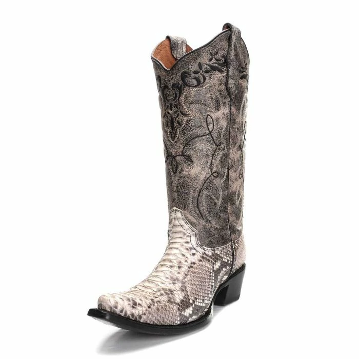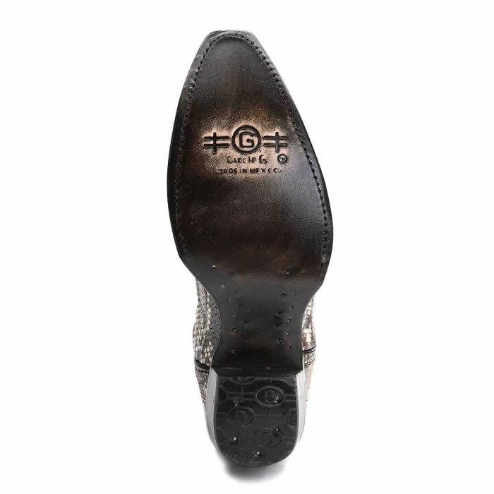 This gorgeous pair of women’s python boots are hand-crafted by Circle G. The level of detailing in this cowgirl boot creates a very unique piece for your collection. The snip-toe foot keeps the natural color and appearance of the python leather. The 13” top is distressed for a worn, vintage look. Styled with a 2” heel and a scalloped collar for a feminine touch.