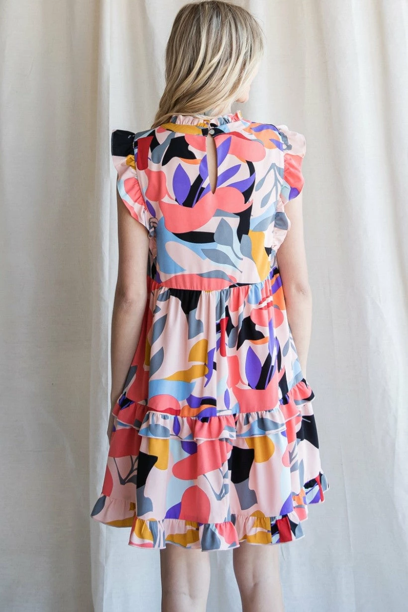 Jodifl floral print frill neckline baby doll dress with ruffle cap sleeves and ruffled tiered layers.
