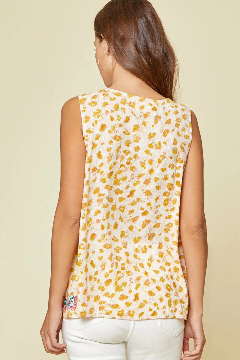 We love sleeveless babydoll tops like this one! Embroidery details on yoke and hem with pom pom lace detail!