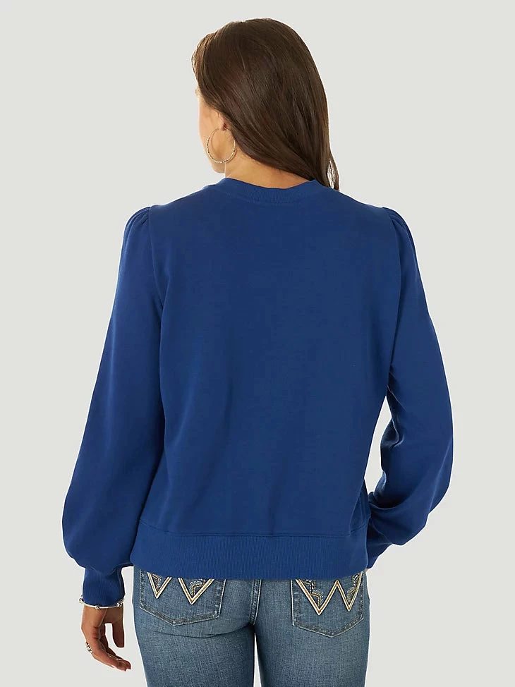 Need a sweatshirt to keep you cozy in the season to come? The women’s Wrangler Retro® puff sleeve logo pullover is comfy, cute, and perfect for cooler days. This easy pullover is made of a soft cotton blend for lightweight warmth. It comes with a classic crewneck silhouette, but its puff sleeves add a little bit of extra volume and sophistication to set your casual look apart. At the chest, the Wrangler® logo pops in a palette of pretty colors. Wear it with your favorite Wrangler Retro jeans to complete the look.