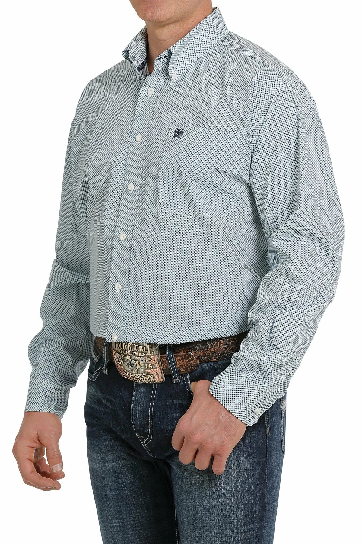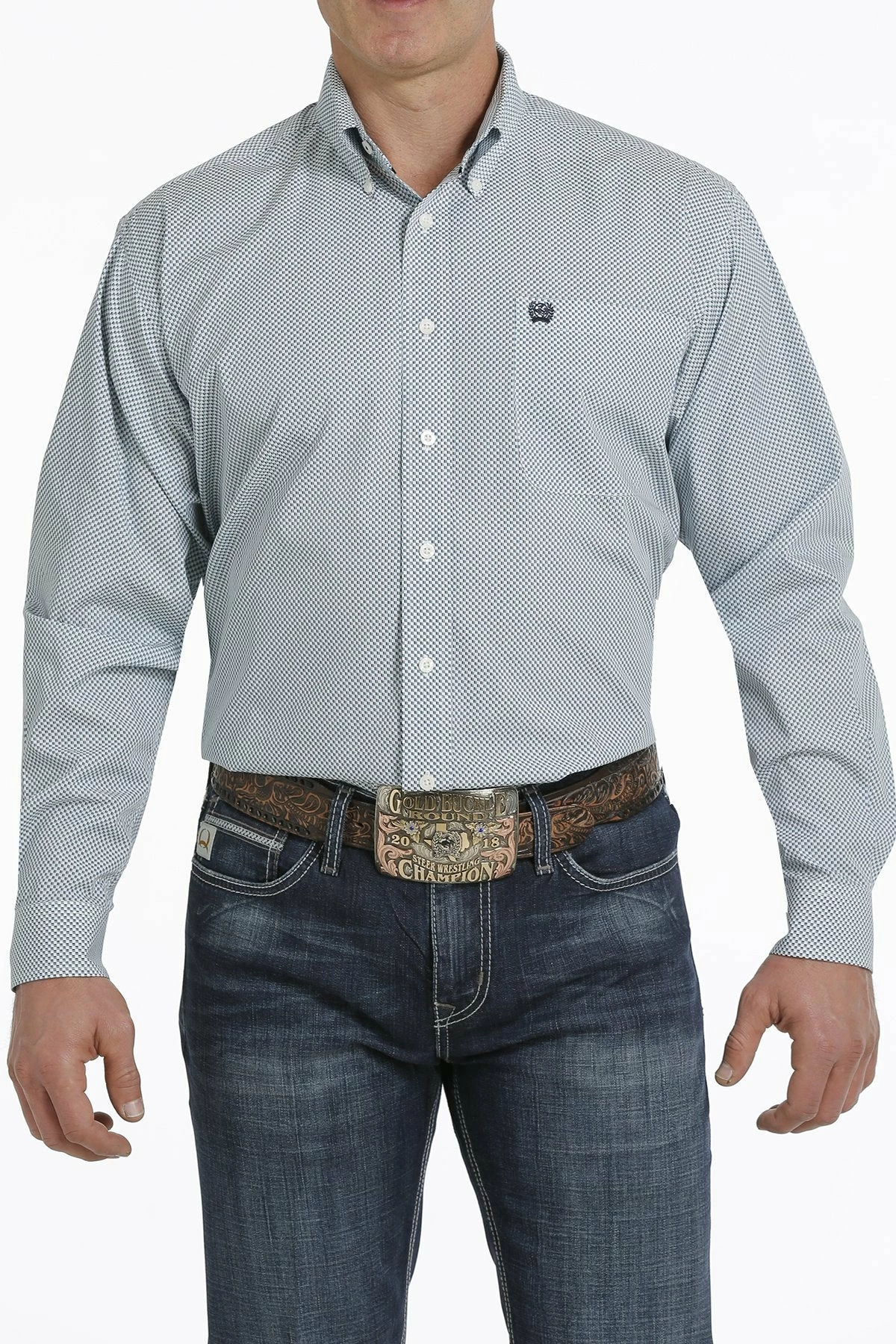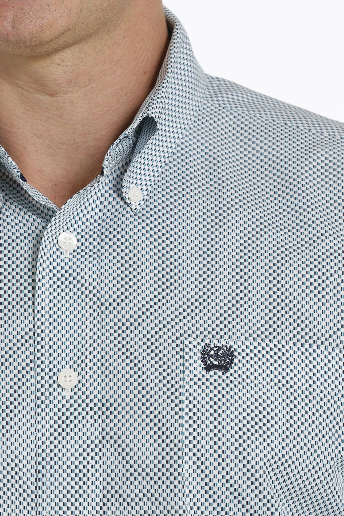 Classic styling and a dense geometric print come together to make up a good-looking cream button down crafted by CINCH. Dress up any jeans or slacks in the closet with this special shirt that features cream buttons and an open left front pocket with embroidered logo. Matching kids available.