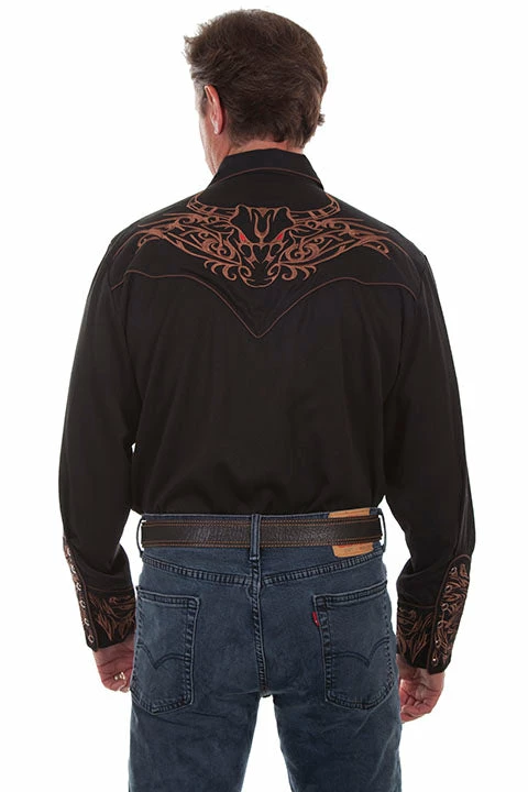 This Scully long sleeve shirt is for the man that likes to make a statement when he goes out. It features an elaborate scrolled embroidery on front and back yokes. Can you find the bucking bull on the front yokes? The back features a stylized longhorn with scroll design.