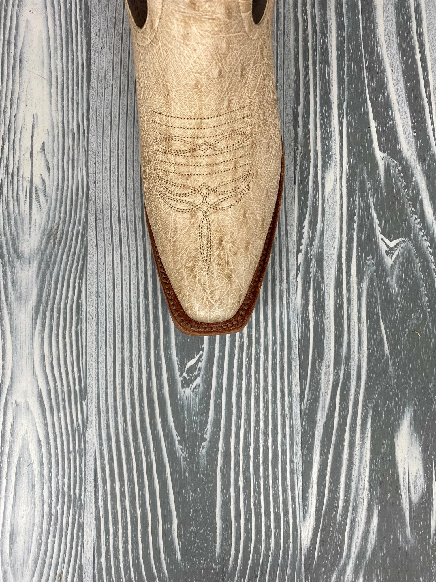 Ostrich is the softest and most comfortable of the “exotic” leathers. It wears well and resists scratching and scuffing – a combination of softness and toughness. Ostrich is naturally resistant to barnyard acid. The quill pattern determines the price of genuine ostrich boots. Where you get a full quill pattern all over the foot, you are buying a much more expensive boot. The size of quill bumps depends on the age of animal and the portion of the hide from which the leather is cut. Ostrich is that ideal combination of durability and wearability which makes it the perfect leather for boots. Always wipe the dust and dirt off ostrich boots after wearing.